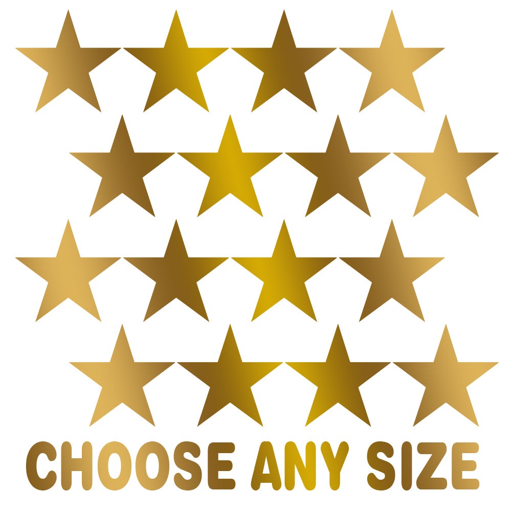 Choose any size! Enhance your space with our Metallic Gold Star Vinyl Wall Decals. Made from high performance grade vinyl, these quality die-cut decal stickers feature an anti-reflective matte finish and can be arranged in a variety of unique styles to decorate walls, vehicles, glass windows, electronics, or any other smooth surface, with easy, clean removal and no sticky residue left behind!