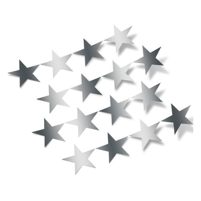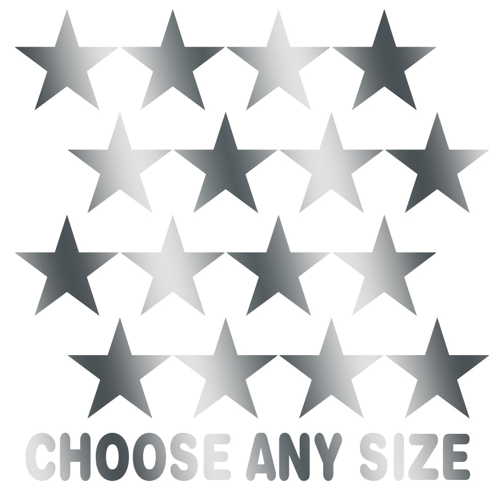 Choose any size! Enhance your space with our Metallic Silver Star Vinyl Wall Decals. Made from high performance grade vinyl, these quality die-cut decal stickers feature an anti-reflective matte finish and can be arranged in a variety of unique styles to decorate walls, vehicles, glass windows, electronics, or any other smooth surface, with easy, clean removal and no sticky residue left behind!